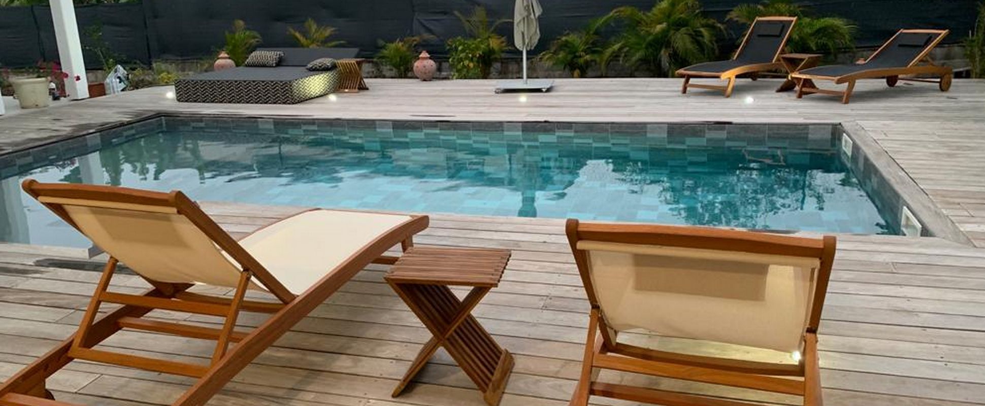 Une grande terrasse avec ses transats, lit de jardin.